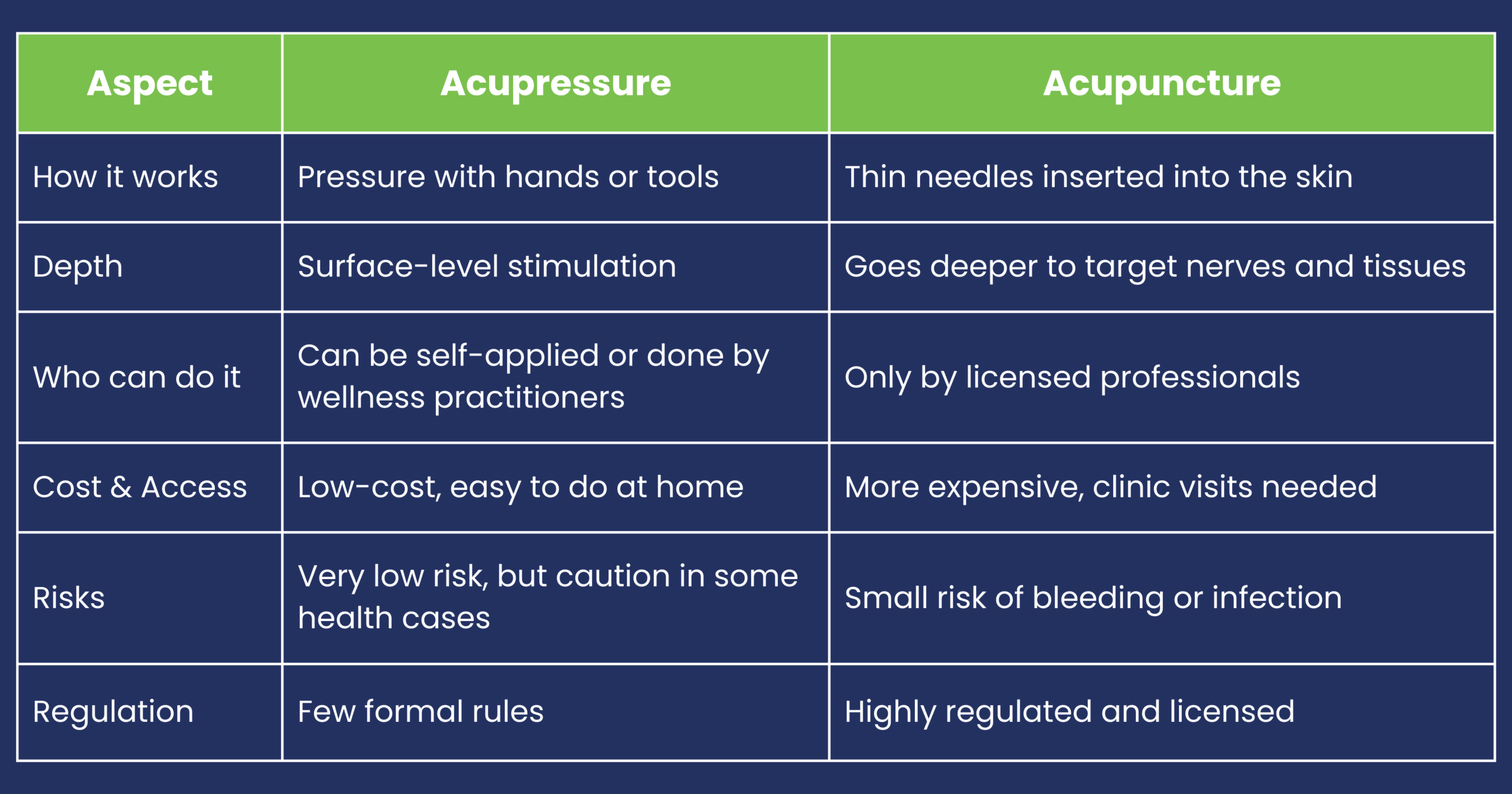 - Acupressure is more accessible and can be practiced without professional supervision, unlike acupuncture which requires licensed practitioners.