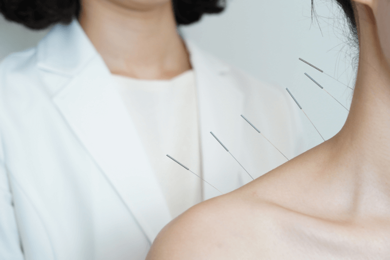 Acupuncture needles placed on woman’s neck and shoulder during treatment