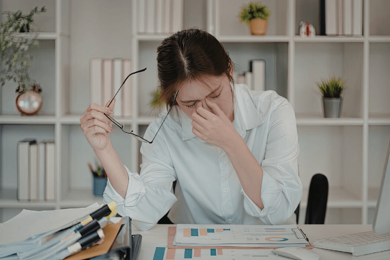 Woman feeling overwhelmed at desk, representing stress-related hormonal imbalance