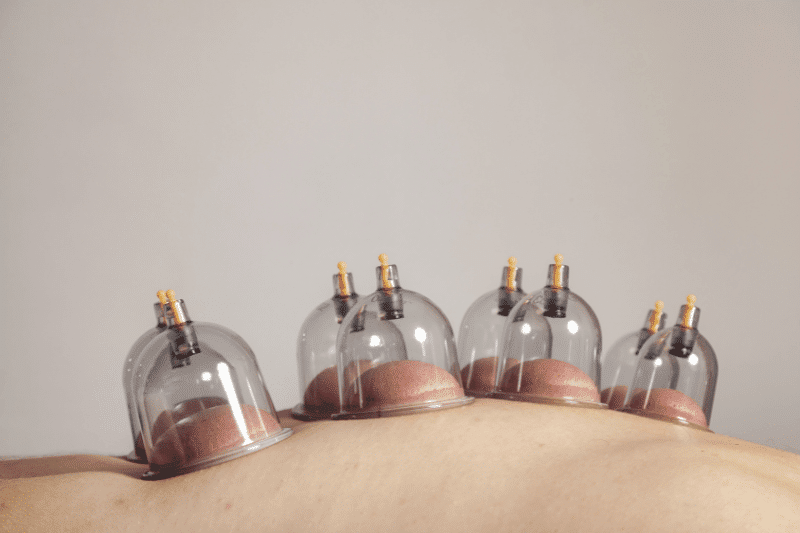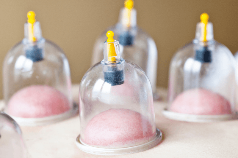 Close-up of cupping therapy cups creating suction on the skin during treatment