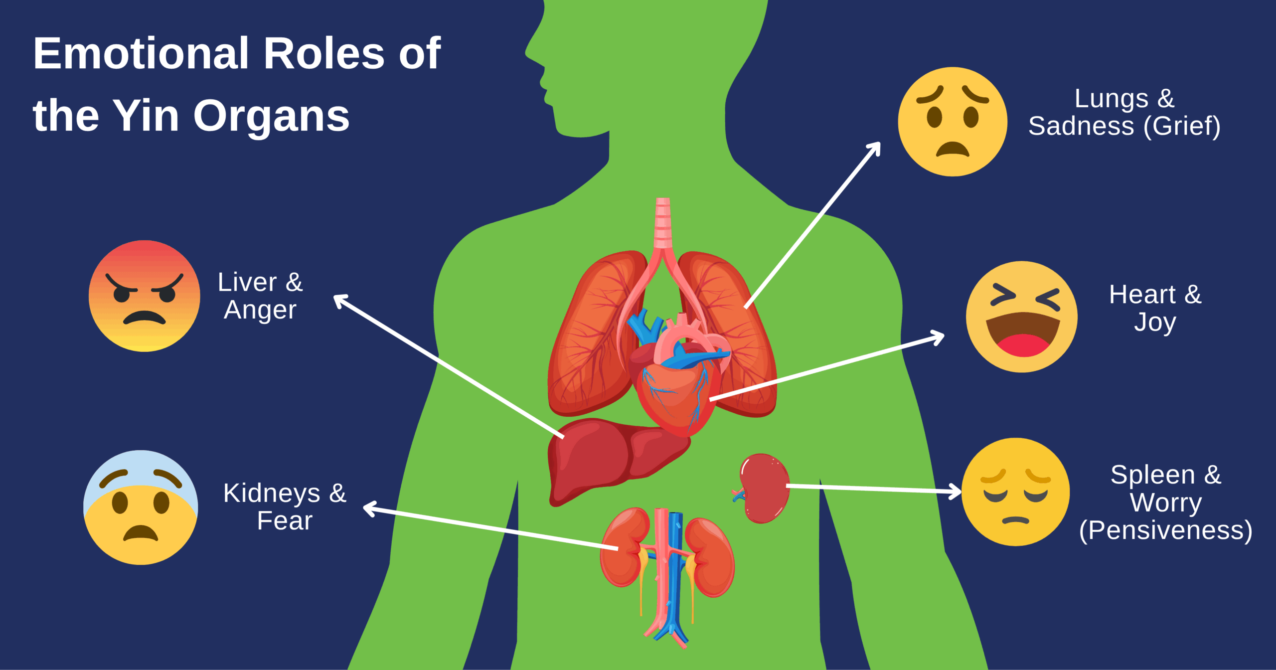 - In Traditional Chinese Medicine, emotions are directly linked to organ function. Anger affects the Liver, joy influences the Heart, worry impacts the Spleen, sadness weakens the Lungs, and fear depletes the Kidneys.
