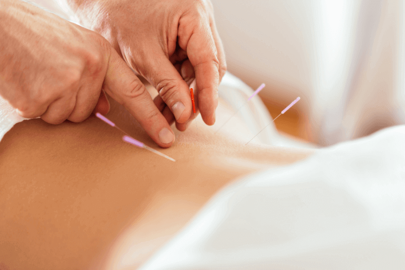 Acupuncturist placing fine needles into the lower back to stimulate therapeutic points