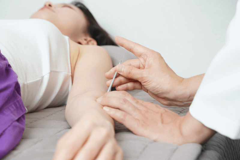 Patient receiving acupuncture needle insertion on the arm during a treatment session