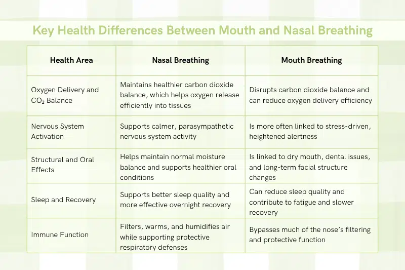 Nasal breathing supports deeper, slower, and more efficient respiration, while mouth breathing promotes shallow breathing, reduces oxygen efficiency, and increases physiological stress.