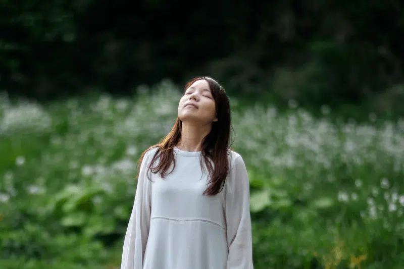Woman outdoors breathing through nose supporting oxygen balance and immune health