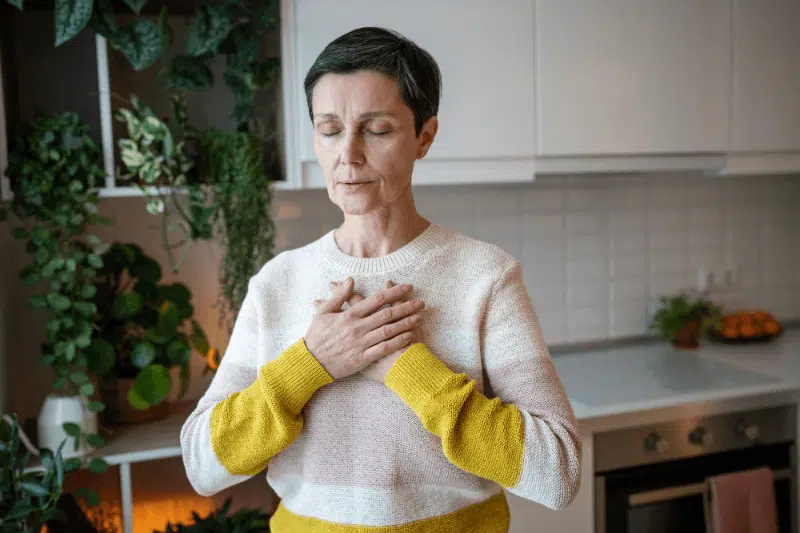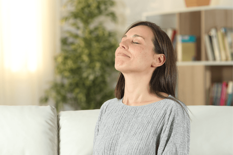 Woman practicing calm nasal breathing to support relaxation and nervous system balance