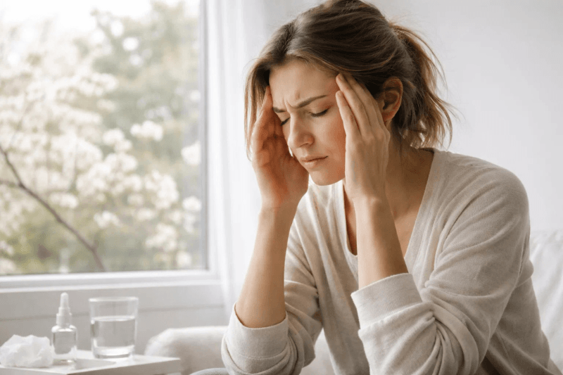 - Seasonal allergy symptoms such as sneezing, nasal congestion, itchy eyes, or sinus pressure