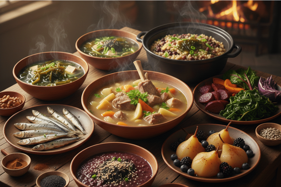 Warm, mineral-rich, gently salty foods strengthen Water energy. Seaweeds, dark beans, bone broth, and cooked winter vegetables build deep reserves.