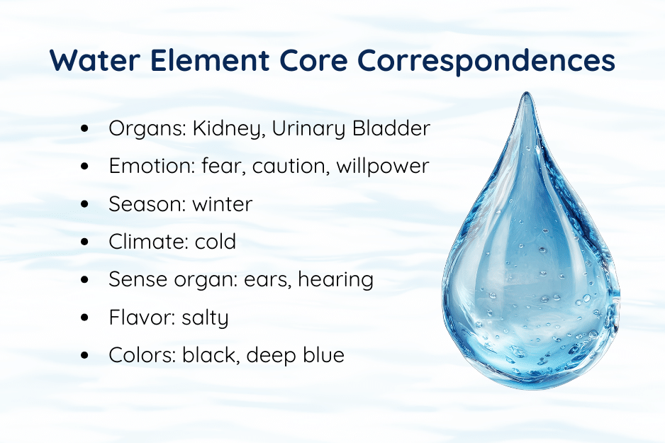 The Water element represents wisdom, adaptability, and the body’s deepest energy reserves.
