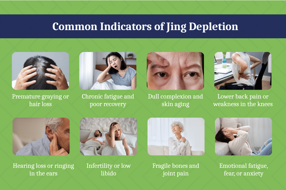 - Excessive stress, poor sleep, and emotional tension draw heavily on kidney energy, draining this essential life force. Over time, Jing depletion manifests as fatigue, hormonal imbalance, and diminished vitality.
