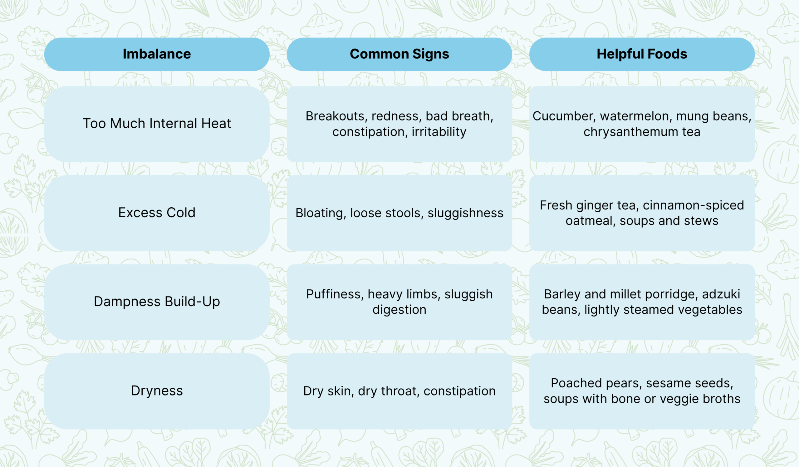 - Small signs of imbalance like heat, cold, dampness, or dryness can be eased with simple ingredient choices and gentle cooking.