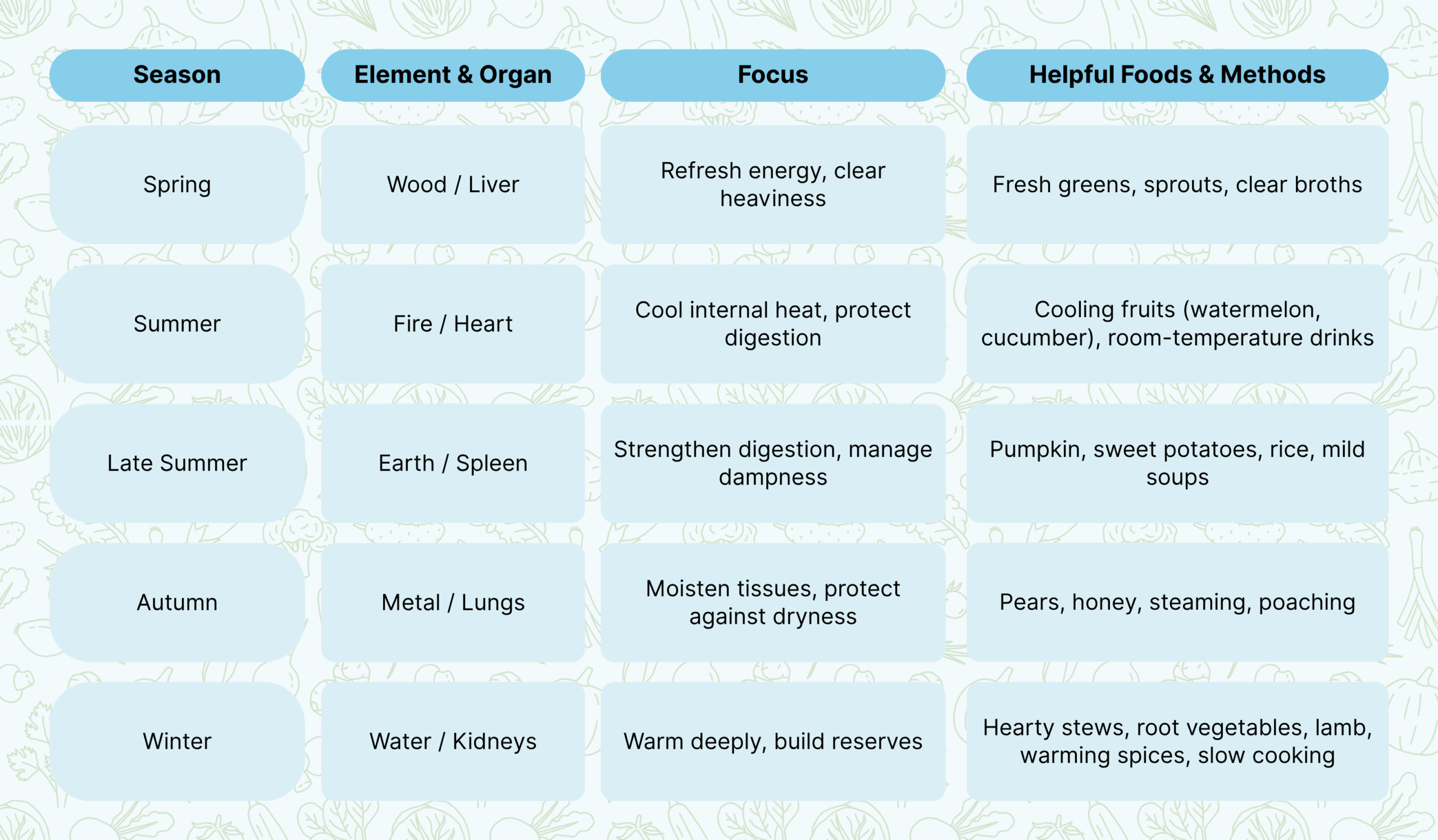 Each part of the year brings its own energy and gentle shifts in how your body feels. Traditional Chinese Medicine encourages small changes in your meals to stay in tune with nature’s rhythm. Aligning what you eat with the seasons can protect your organs, keep digestion steady, and help your energy stay balanced all year long.