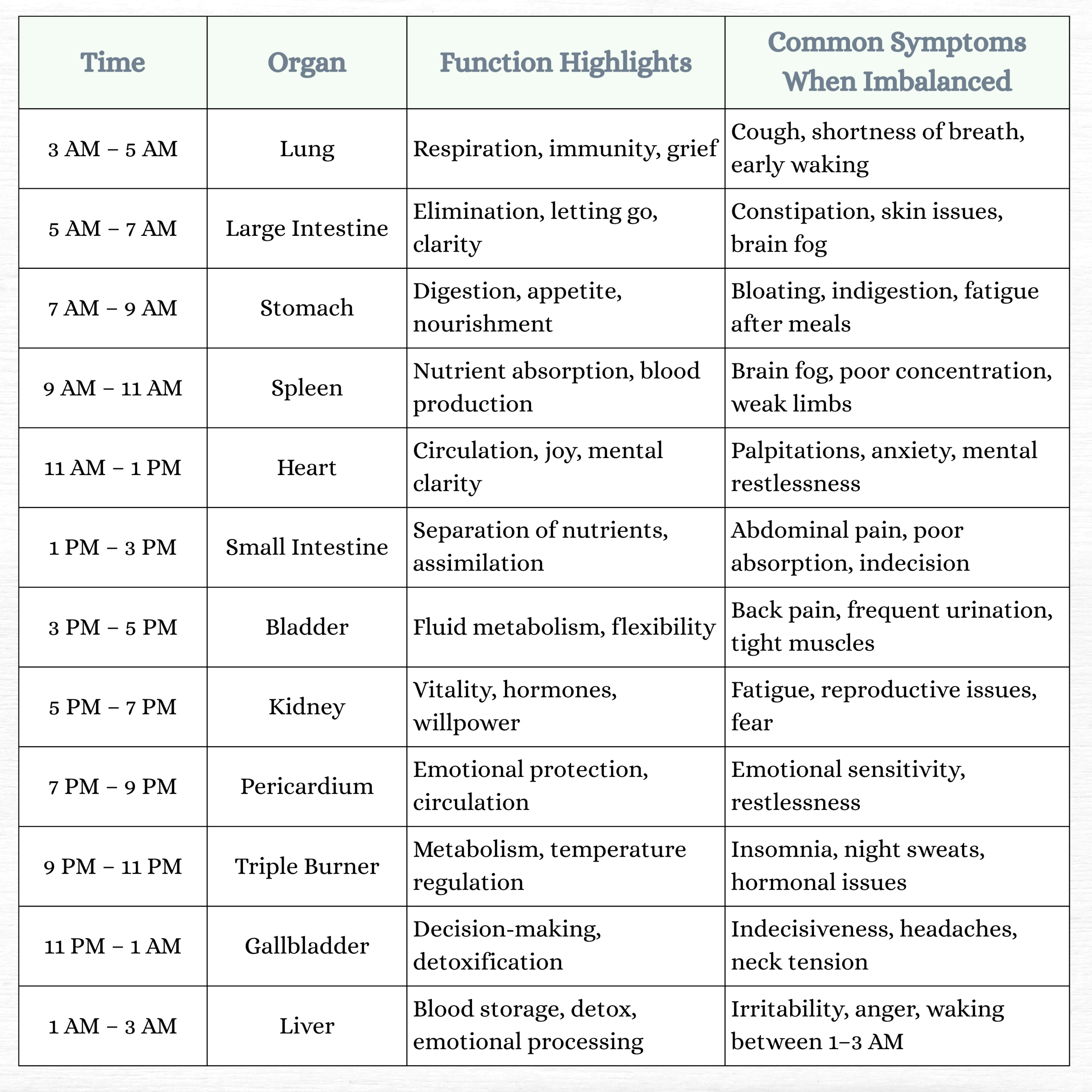 By aligning your lifestyle and habits with these organ timeframes, you can better support your health, understand emotional fluctuations, and respond to signs of internal disharmony. Below is a breakdown of each organ’s peak time, its essential functions, and common symptoms that may arise when its energy is imbalanced.