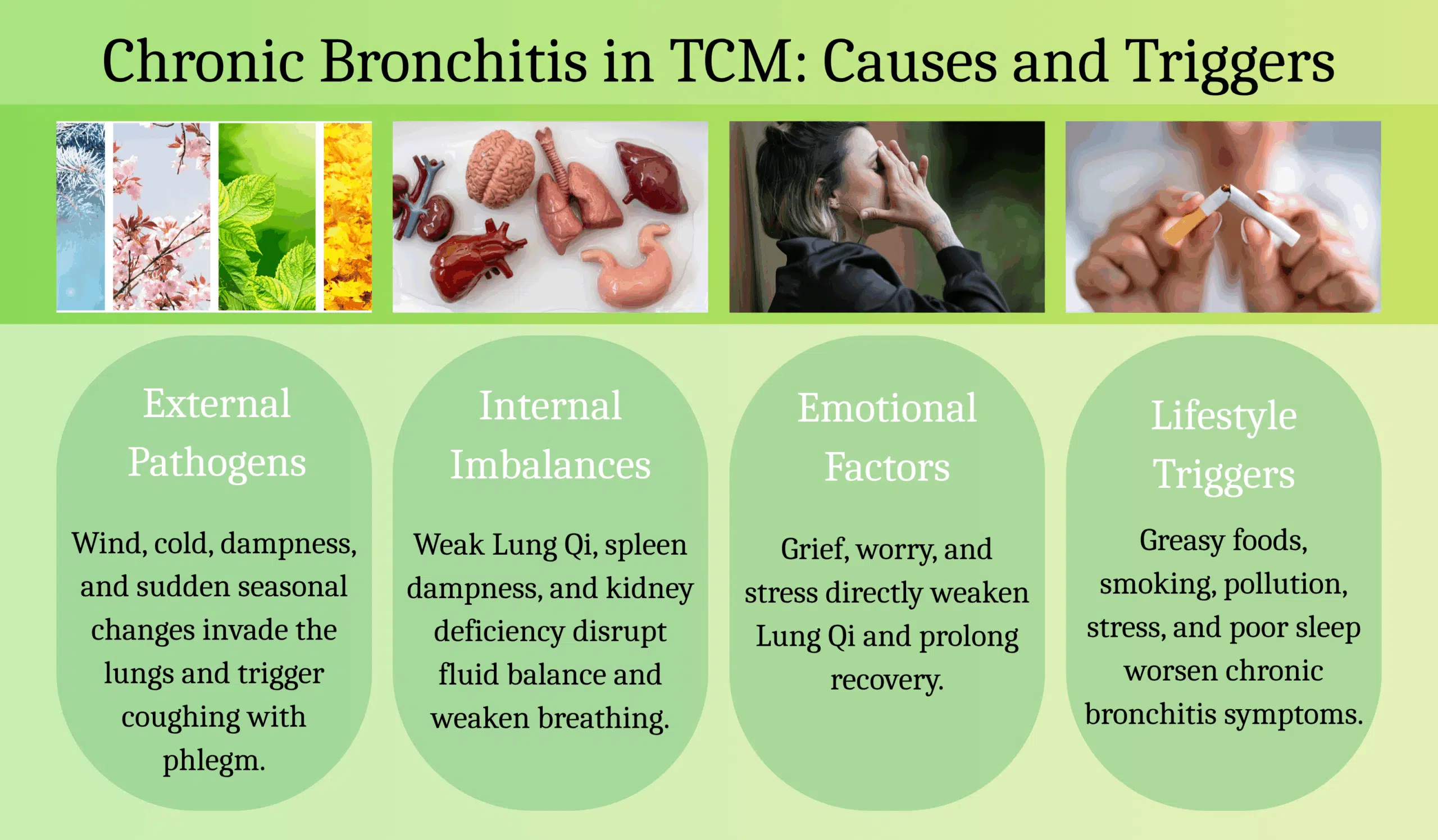 In Traditional Chinese Medicine, chronic bronchitis is understood as the result of both internal weakness and external invasions. Instead of looking at the lungs in isolation, TCM sees the condition as a disruption in the flow of Qi and fluids across the body.