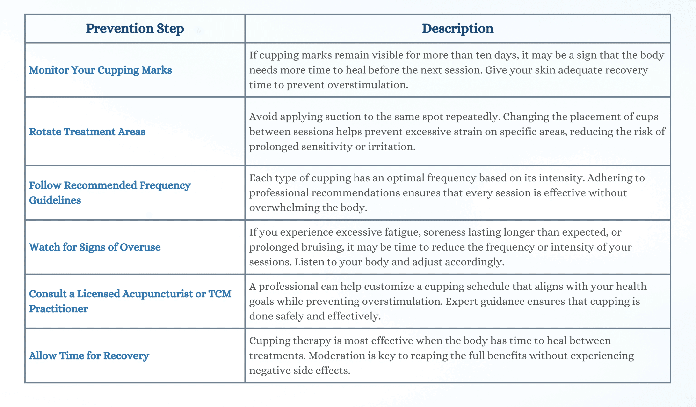 • Overusing cupping can lead to bruising, fatigue, and reduced effectiveness, making it important to allow proper recovery time between sessions.