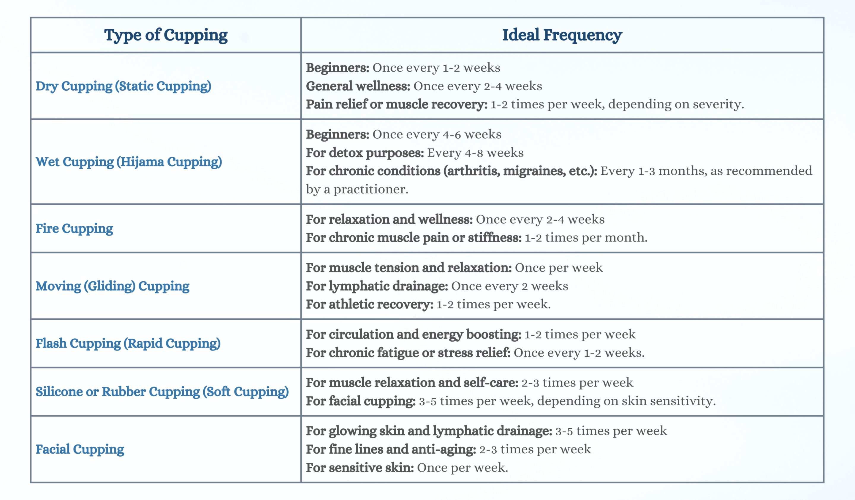 • Different cupping techniques have different ideal schedules, with dry and moving cupping safe for weekly use, and wet or fire cupping needing 4–8 weeks between treatments.